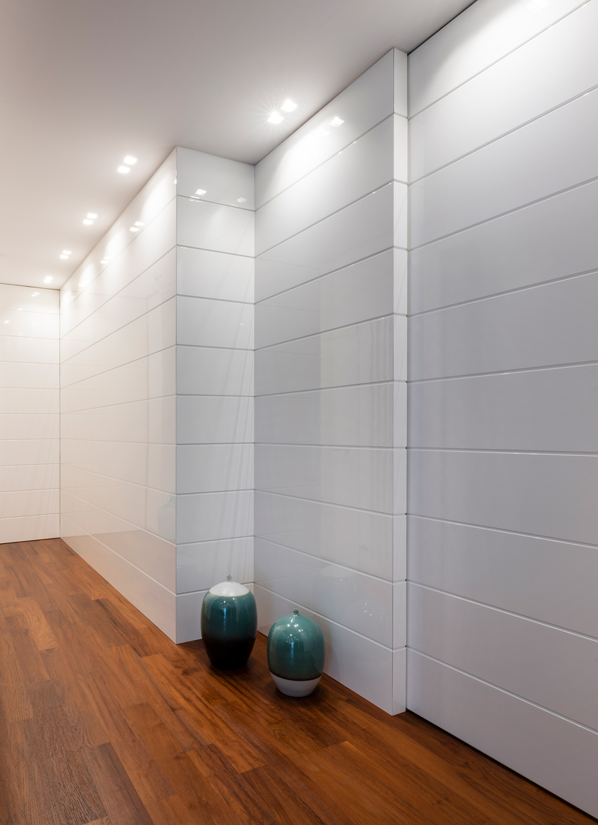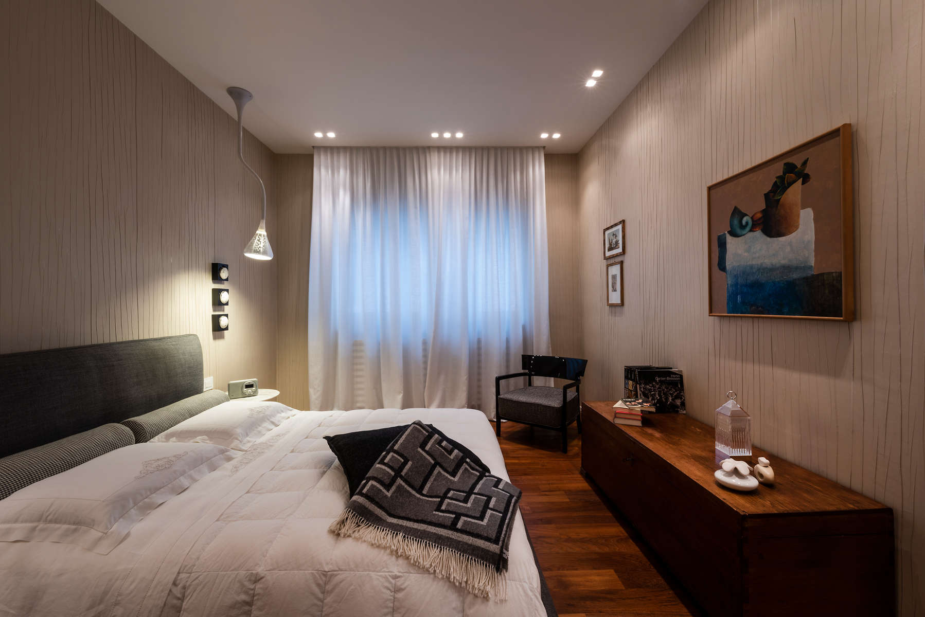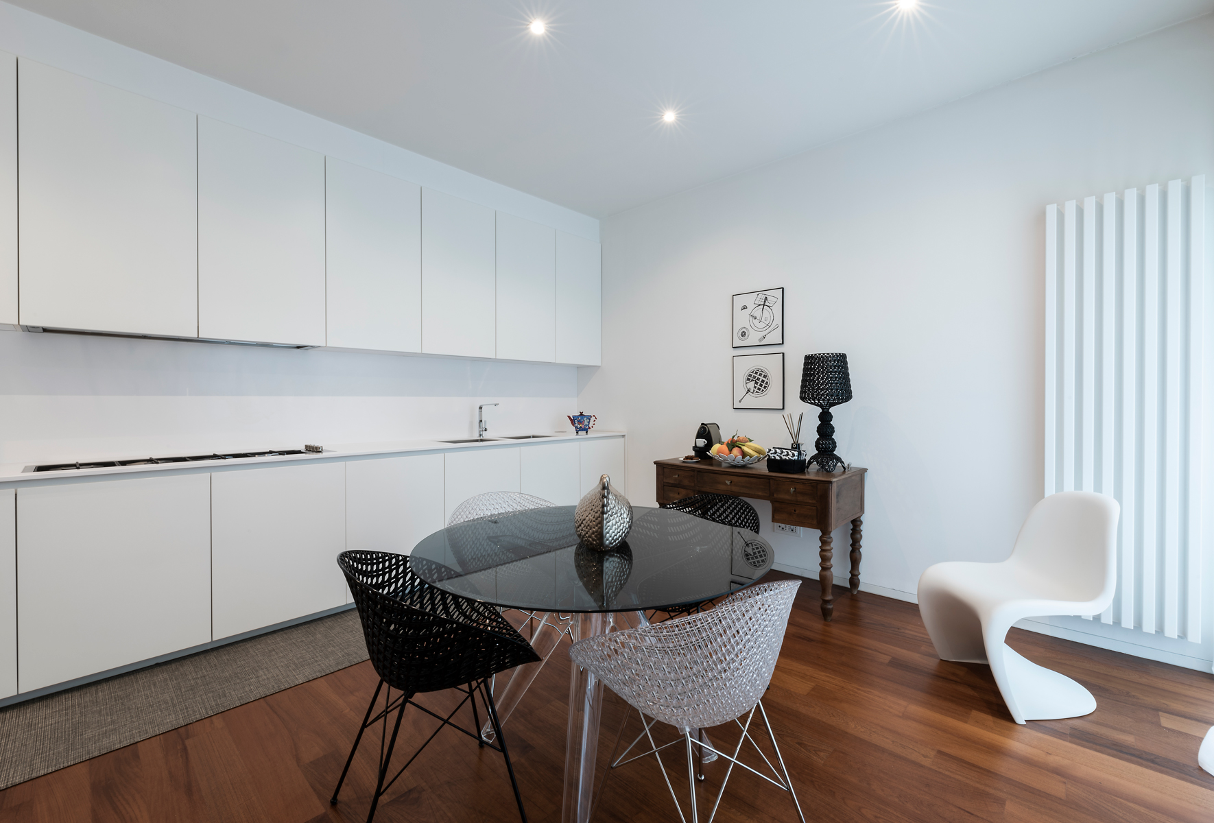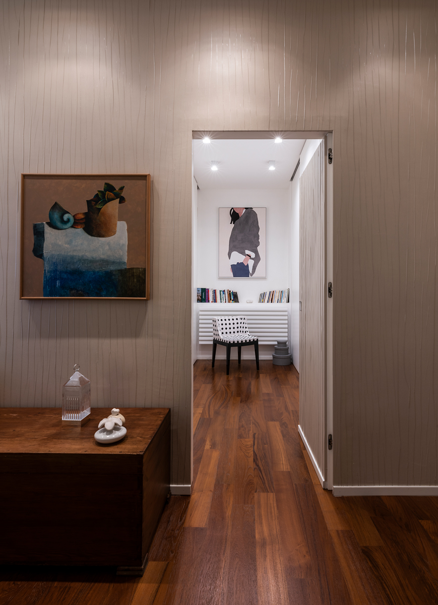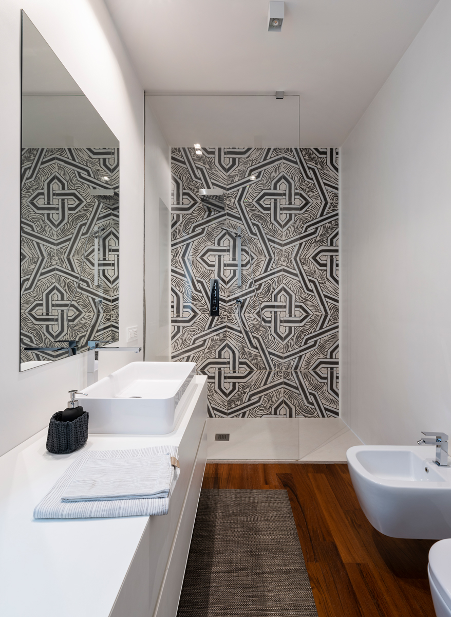 L'accuratezza nei materiali è il filo conduttore degli interni di quest'abitazione: il parquet in teak, i rivestimenti e l'utilizzo di textures accuratamente selezionate, danno un'impronta molto personale e contemporanea agli ambienti. Il sapiente accostamento tra arredi antichi ed elementi estremamente lineari e moderni disegnati e progettati da La Bottega sul Ponte, rendono l’ambiente caldo ed accogliente.